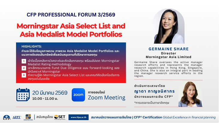 สมาคมนักวางแผนการเงินไทยจัดกิจกรรม CFP® Professional Forum ครั้งที่ 3/2569 เมื่อวันที่ 20 มีนาคม 2569 ในหัวข้อ “Morningstar Asia Select List and Asia Medalist Model Portfolios” โดยได้รับเกียรติจากคุณ Germaine Share, Director Morningstar Asia Limited ที่มาให้ข้อมูลความรู้เกี่ยวกับ Asia Medalist Model Portfolios และแนวทางการจัดสรรสินทรัพย์เพื่อสนับสนุนงานที่ปรึกษาการลงทุน ให้แก่นักวางแผนการเงิน CFP และที่ปรึกษาการเงิน AFPT ทราบ โดยมีคุณญาดา กาญจนิศากร CFP® เป็นผู้ดำเนินรายการ กิจกรรมครั้งนี้ มีสมาชิกสมาคมฯ เข้าร่วม 725 คน