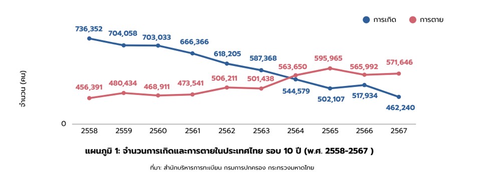 รูปที่ 1: ภาพแสดงอัตราการเกิดและเสียชีวิตในระหว่างปี 2558 - 2567