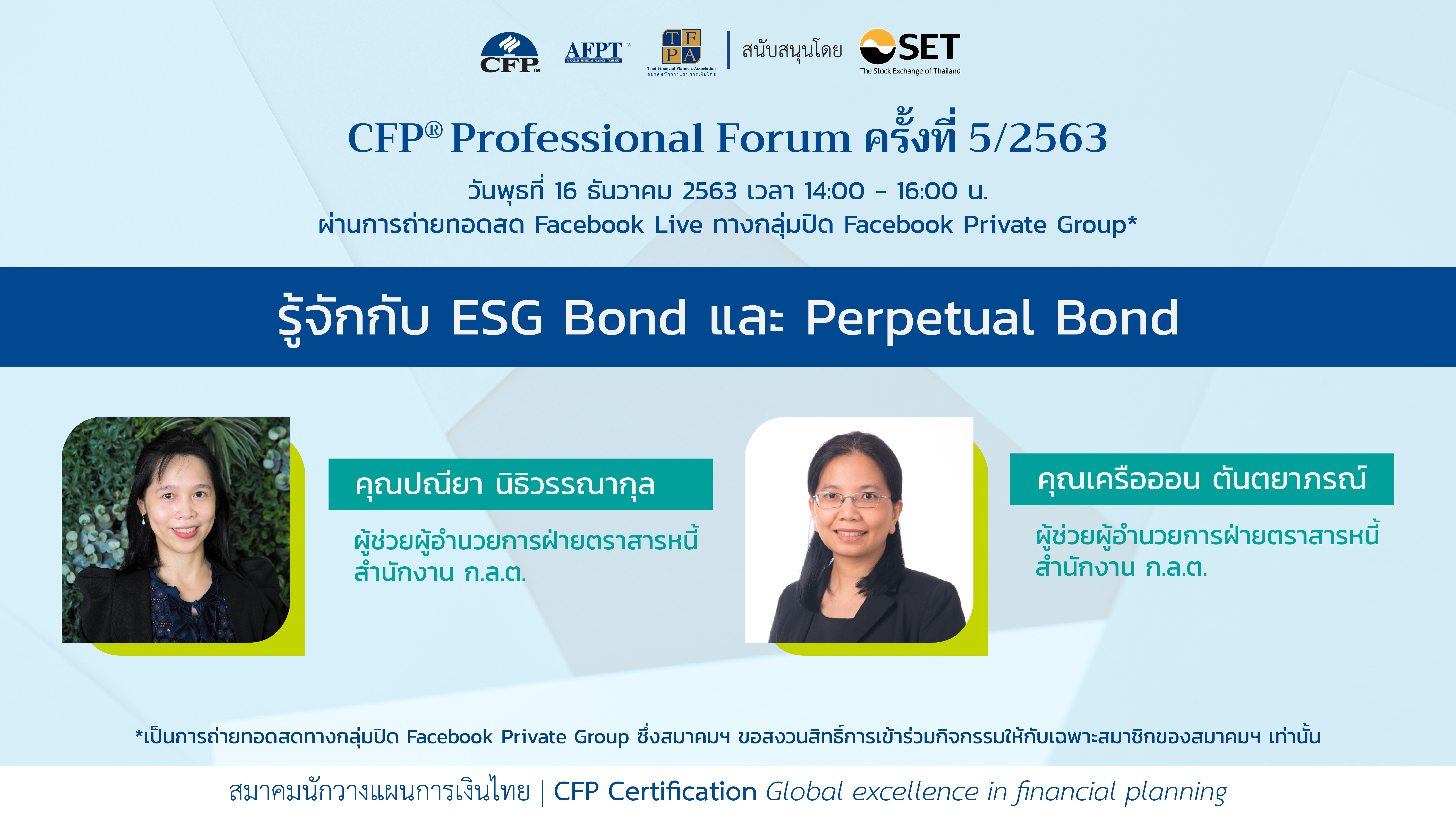 คุณปณียา นิธิวรรณากุล ผู้ช่วยผู้อำนวยการฝ่ายตราสารหนี้ และคุณเครือออน ตันตยาภรณ์ ผู้ช่วยผู้อำนวยการฝ่ายตราสารหนี้ สำนักงาน ก.ล.ต. ให้เกียรติเป็นวิทยากรบรรยายให้ความรู้ในหัวข้อ “รู้จักกับ ESG Bond และ Perpetual Bond” เมื่อวันที่ 16 ธันวาคม 2563 เวลา 14.00 – 16.00 น. ในกิจกรรม CFP® Professional Forum ครั้งที่ 5/2563 ผ่านการถ่ายทอดสดออนไลน์ทาง Facebook Private Group มีสมาชิกสมาคมฯ รับชมการถ่ายทอดสดจำนวน 488 คน