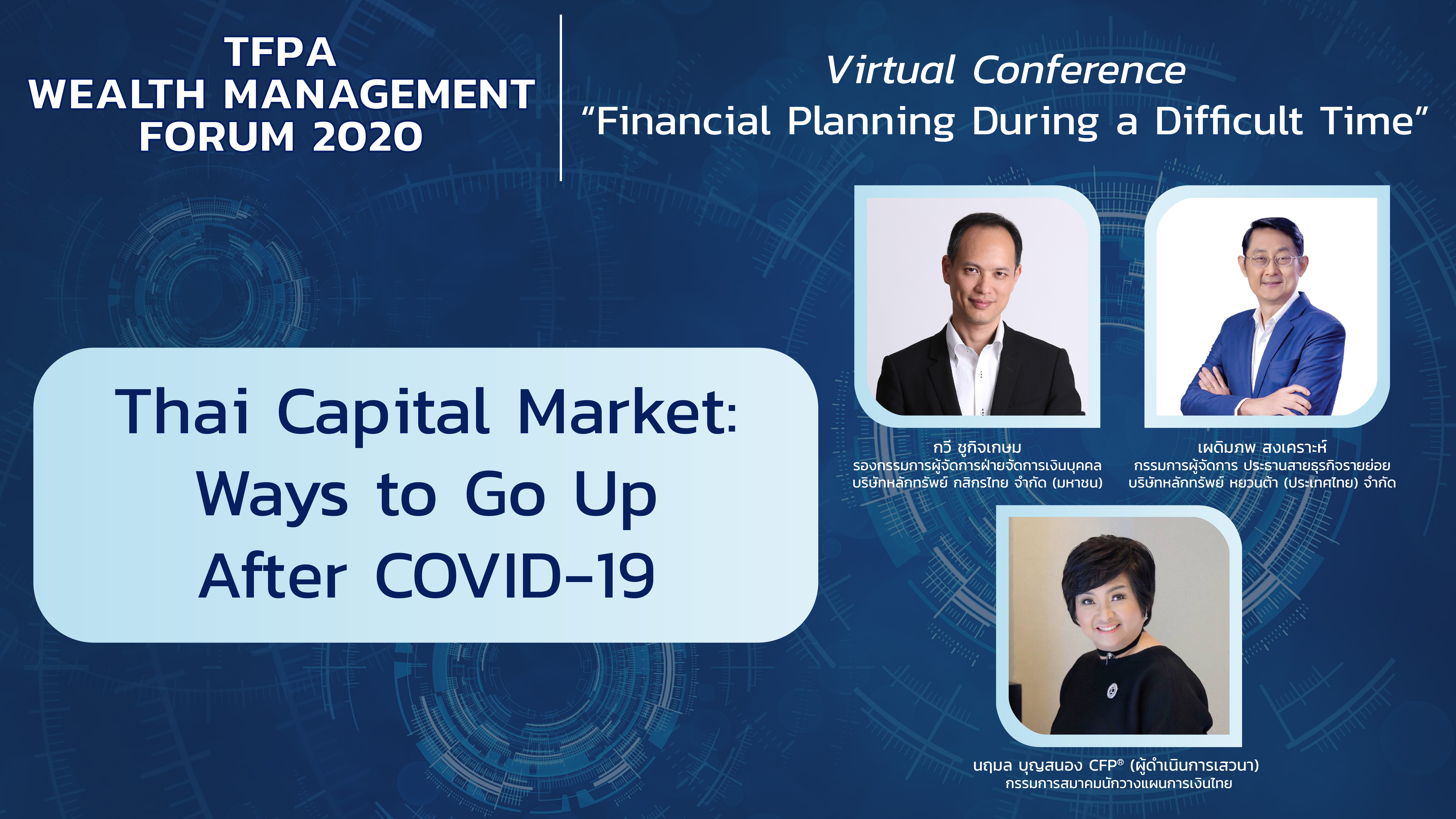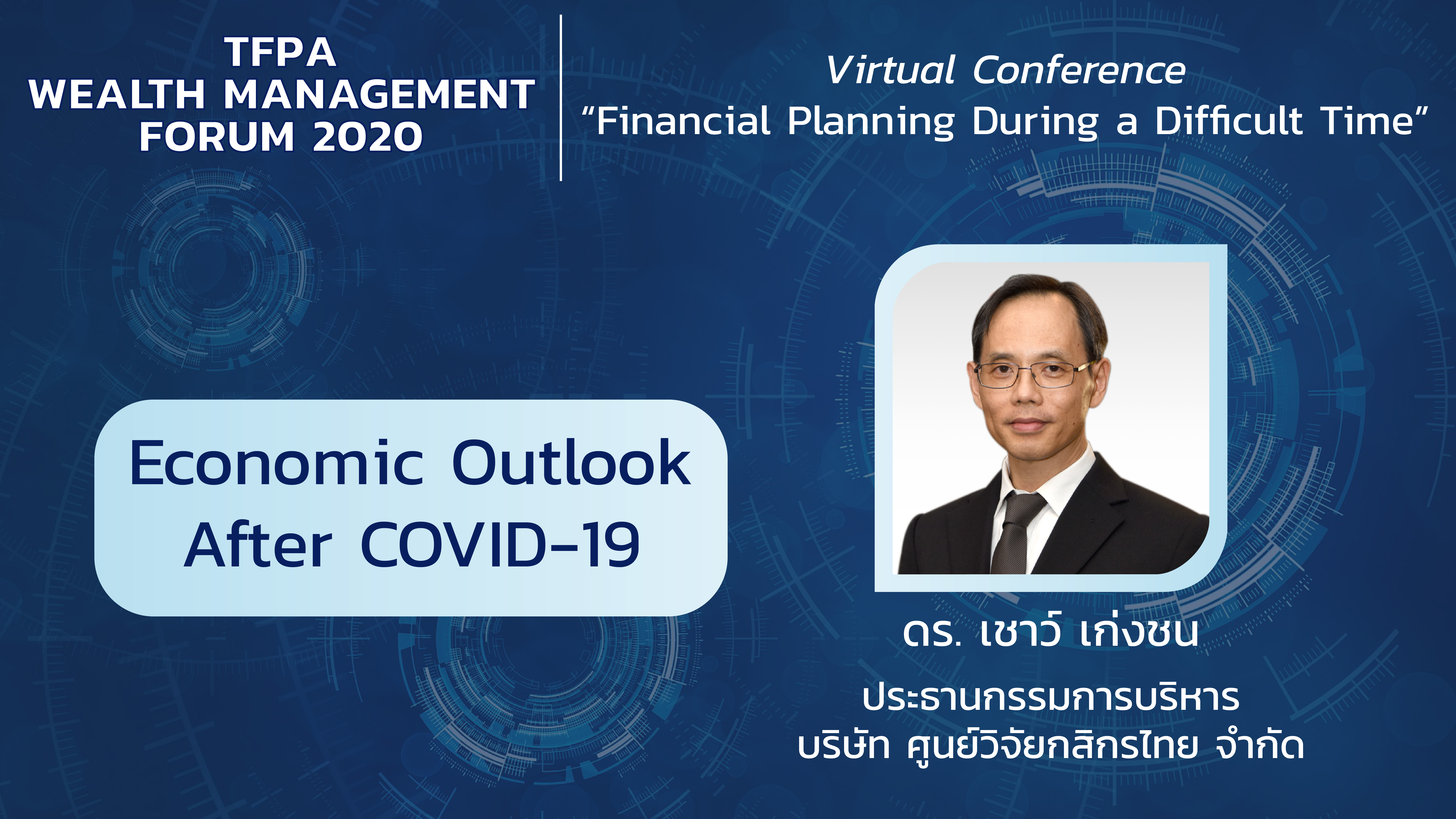 สวัสดีครับ วารสาร TFPA Bulletin ฉบับส่งท้ายปี 2563 ในคอลัมน์ Cover Story ขอนำเสนอสรุปสาระสำคัญจากงานสัมมนา TFPA Wealth Management Forum 2020 ซึ่งครั้งนี้เป็นปีแรกที่สมาคมฯ จัดงานดังกล่าวในรูปแบบออนไลน์ ธีมหลักของการสัมมนาในปีนี้ คือ Financial Planning During a Difficult Time สมาคมฯ ได้รับเกียรติจากวิทยากรผู้ทรงคุณวุฒิมาร่วมแบ่งปันมุมมองและประสบการณ์ที่น่าสนใจและเป็นประโยชน์อย่างมากต่อการนำไปประยุกต์ใช้ ทั้งในการปฏิบัติงานและการดำเนินชีวิตส่วนตัว ผ่านการบรรยายและการเสวนาในประเด็นต่างๆ ได้แก่ แนวโน้มเศรษฐกิจไทยหลังโควิด 19 ผลกระทบของโควิด 19 ที่มีต่อการลงทุนในตลาดหุ้น ทางเลือกการลงทุนในสถานการณ์ที่มีความเสี่ยงเรื่องสภาพคล่อง การเตรียมตัวเมื่อต้องเผชิญหน้ากับสถานการณ์ที่ต้องเกษียณโดยไม่ได้ตั้งใจ และการบริหารจัดการเรื่องการเงิน หนี้สิน การลงทุน และการวางแผนเพื่อสามารถรับมือได้อย่างเหมาะสมหากเกิดสถานการณ์ฉุกเฉิน