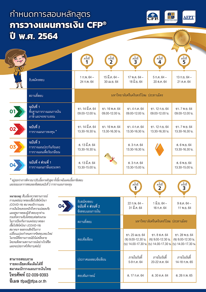 - ตารางสอบหลักสูตรการวางแผนการเงิน CFP® ปี 2564